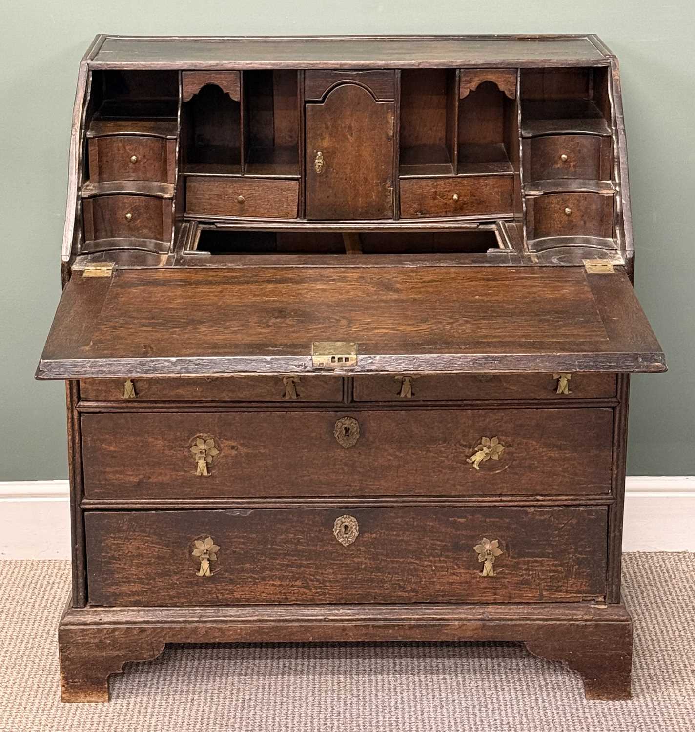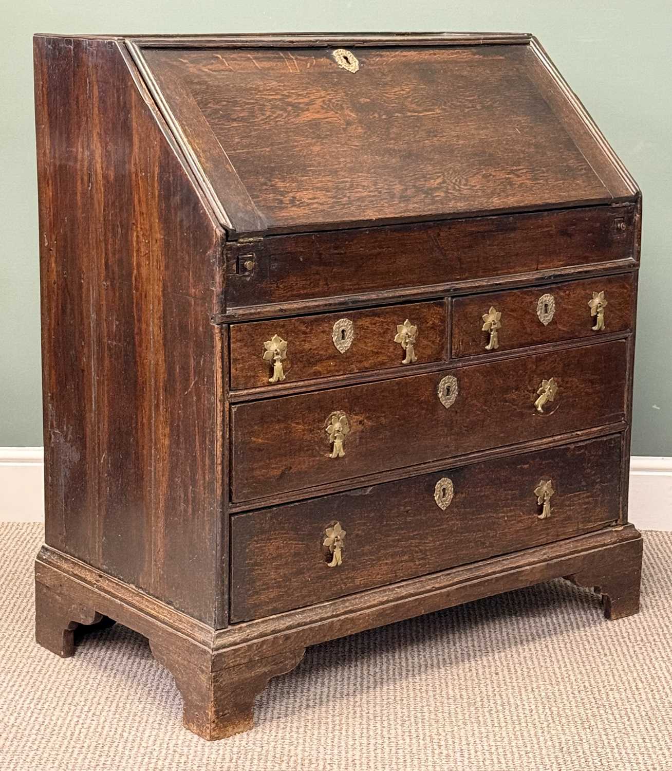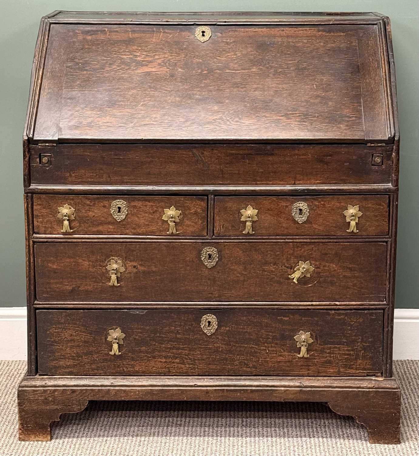 auto draft18TH CENTURY OAK BUREAU, fall front enclosing fitted interior with well, over three long drawers,