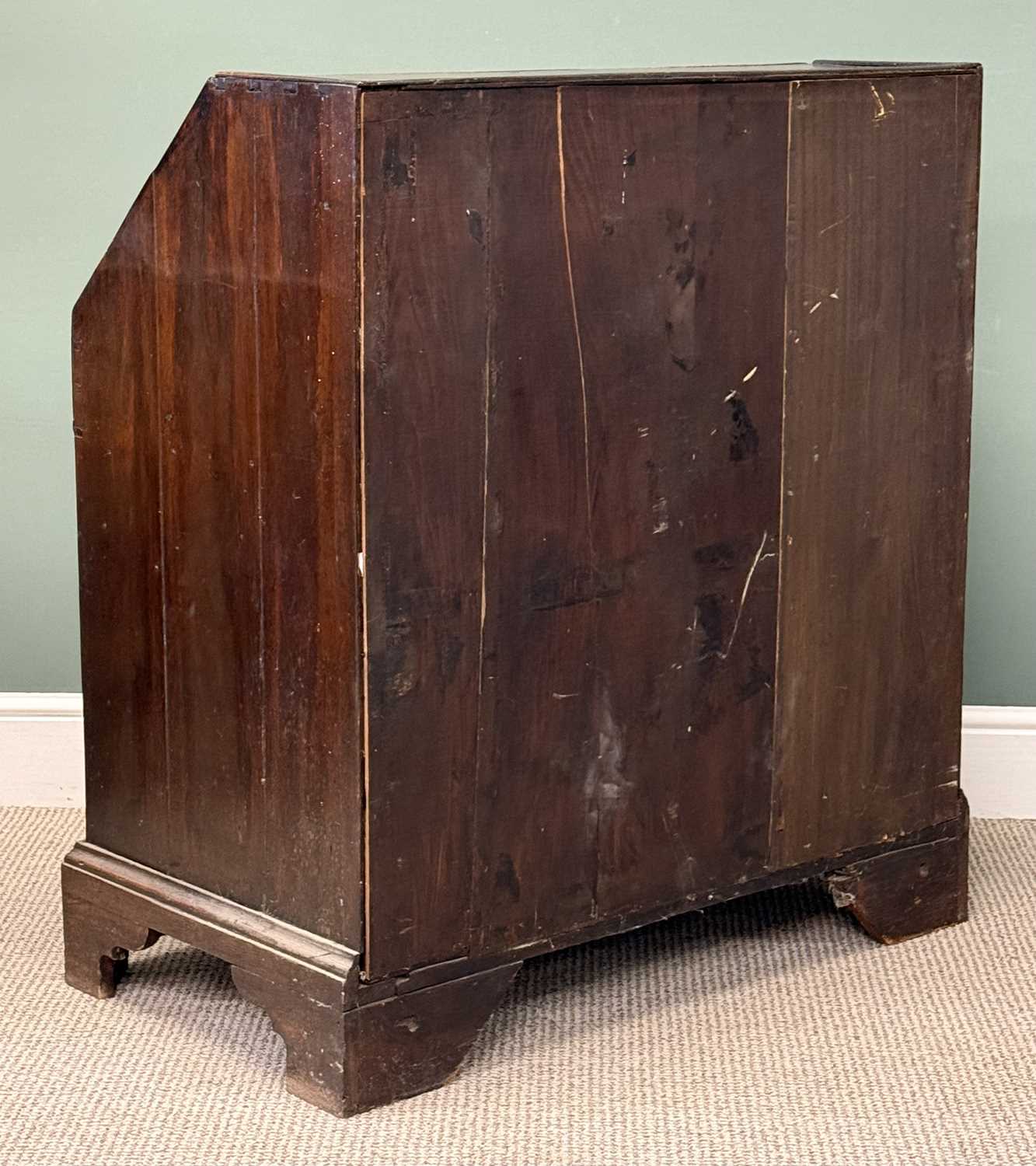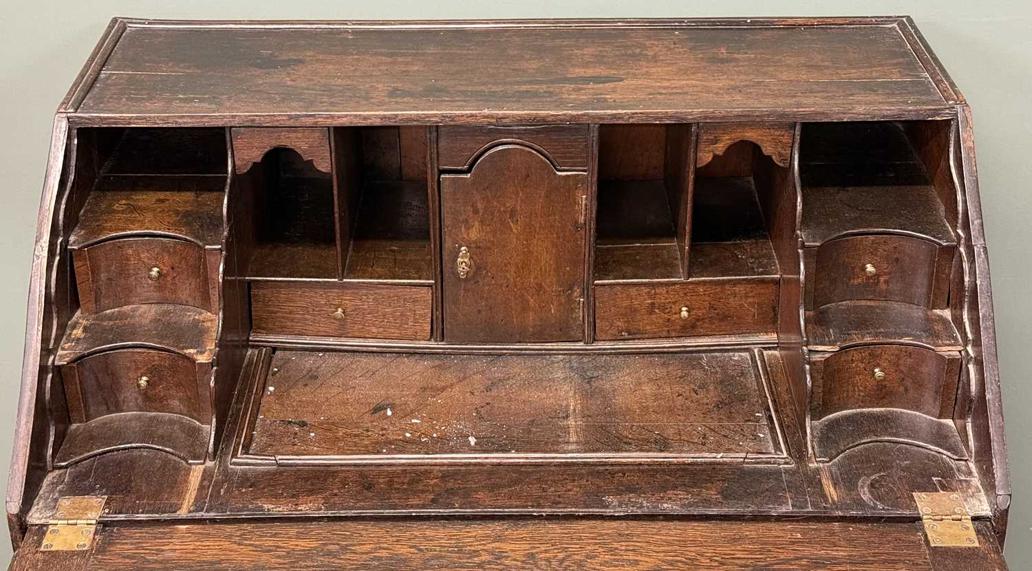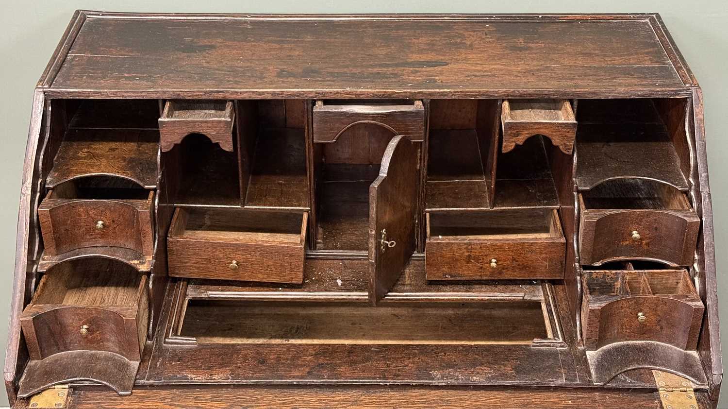 auto draft18TH CENTURY OAK BUREAU, fall front enclosing fitted interior with well, over three long drawers,