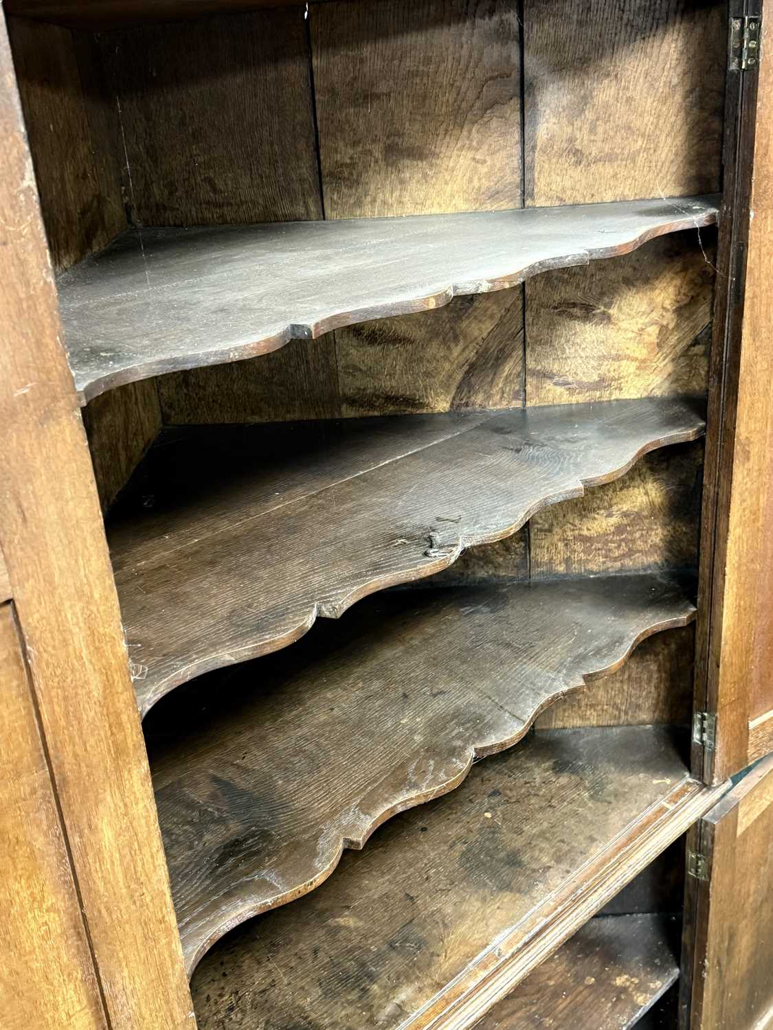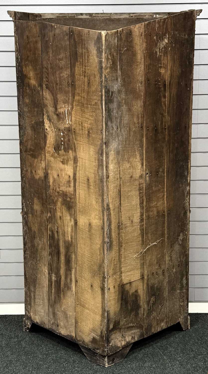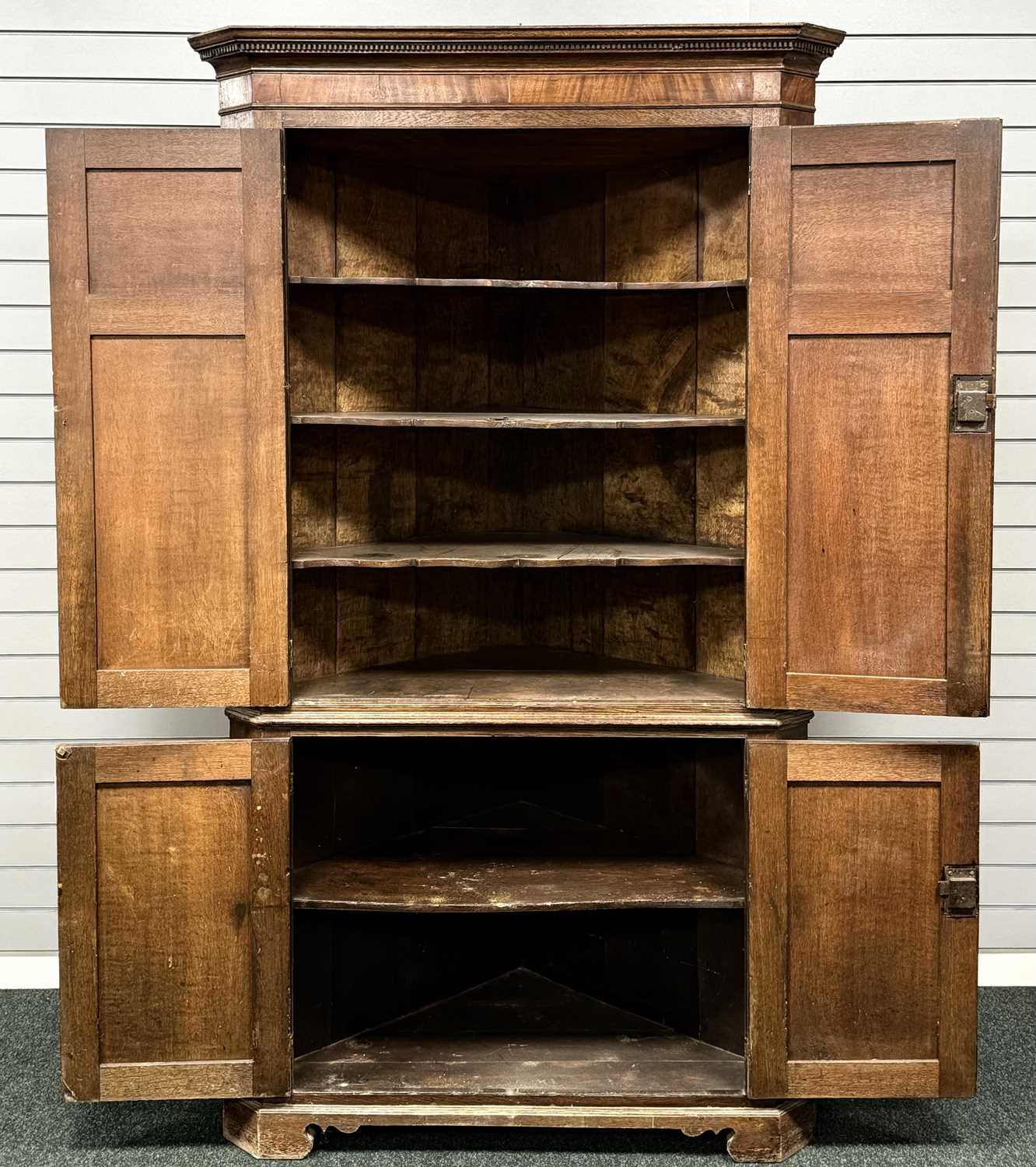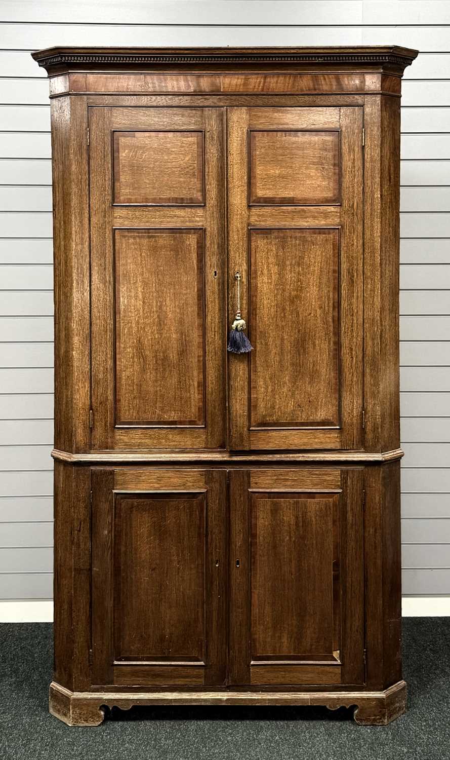 ANTIQUE OAK FREESTANDING CORNER CUPBOARD, cross banded in mahogany, moulded dentil cornice over four