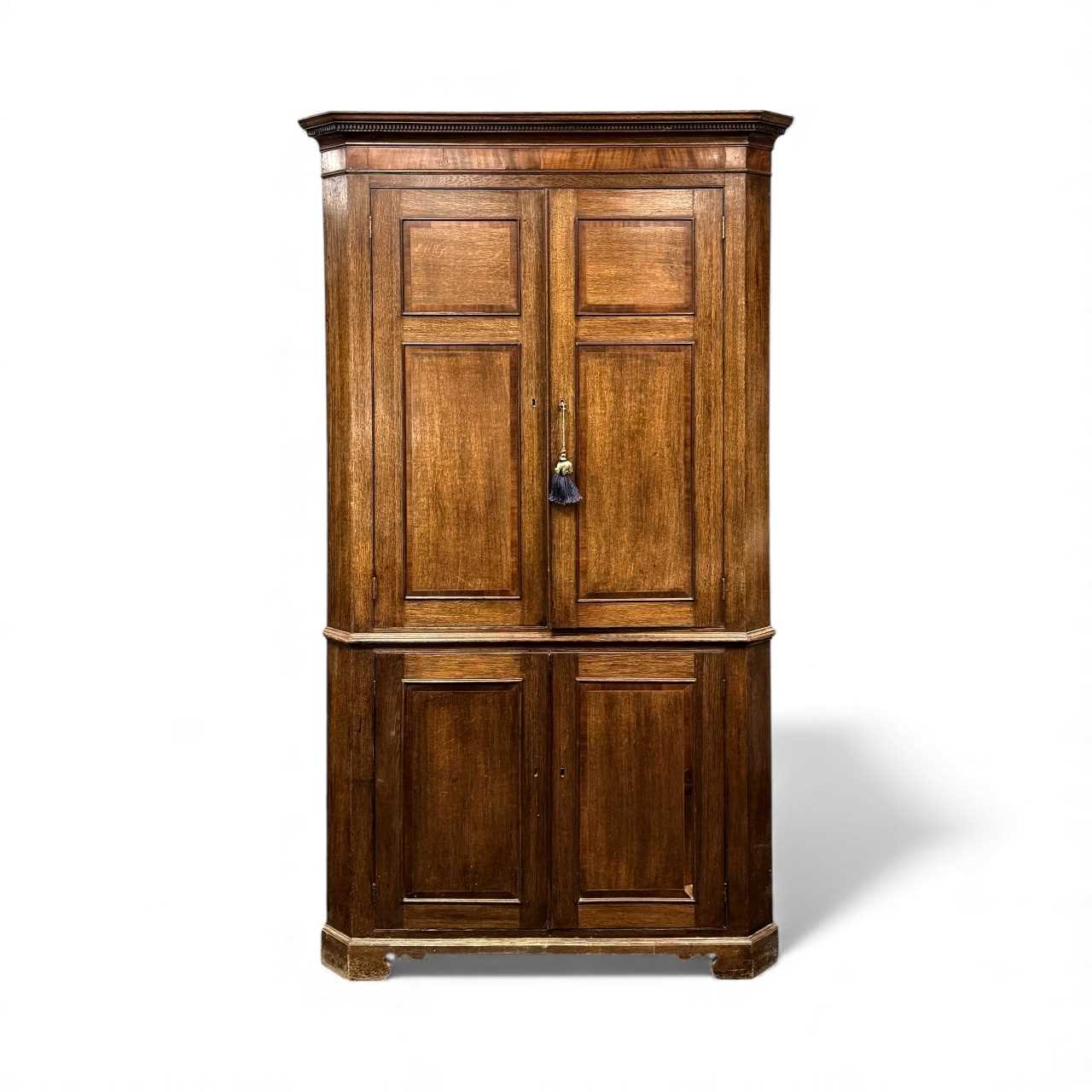 ANTIQUE OAK FREESTANDING CORNER CUPBOARD, cross banded in mahogany, moulded dentil cornice over four panelled doors, shelved interior, on bracket feet, 211 (h) x 115 (w) x 66cms (d)