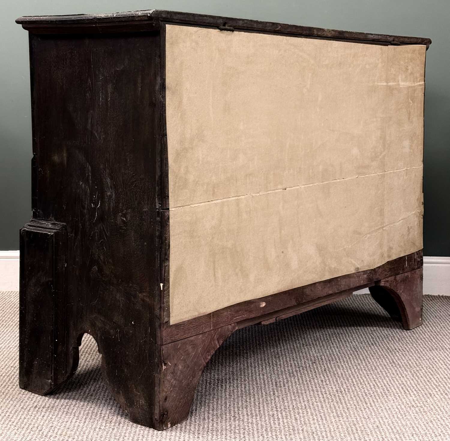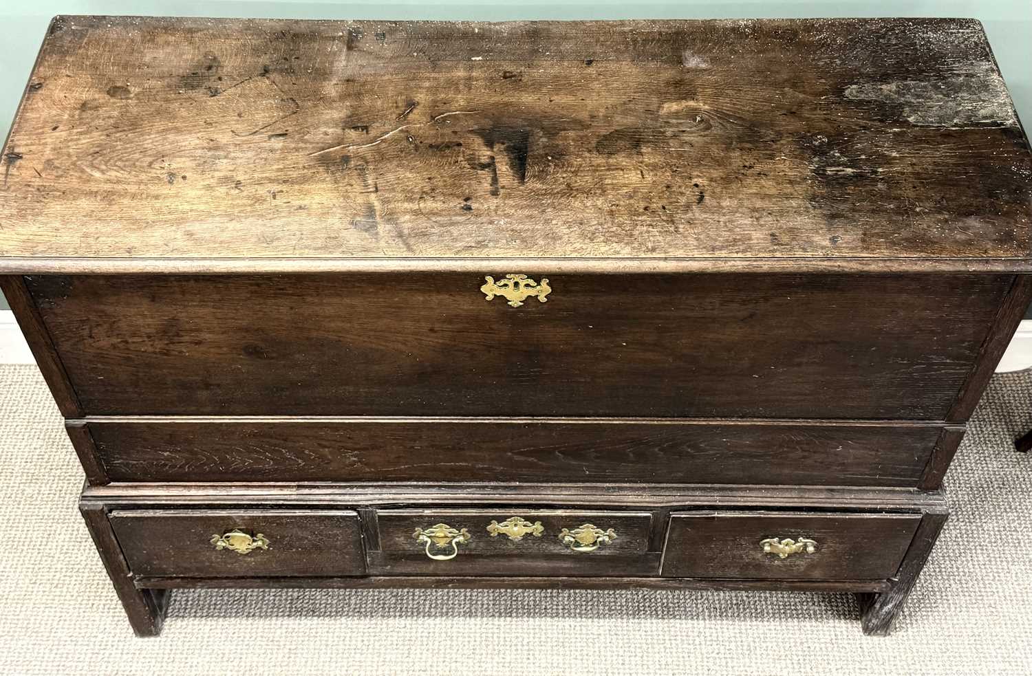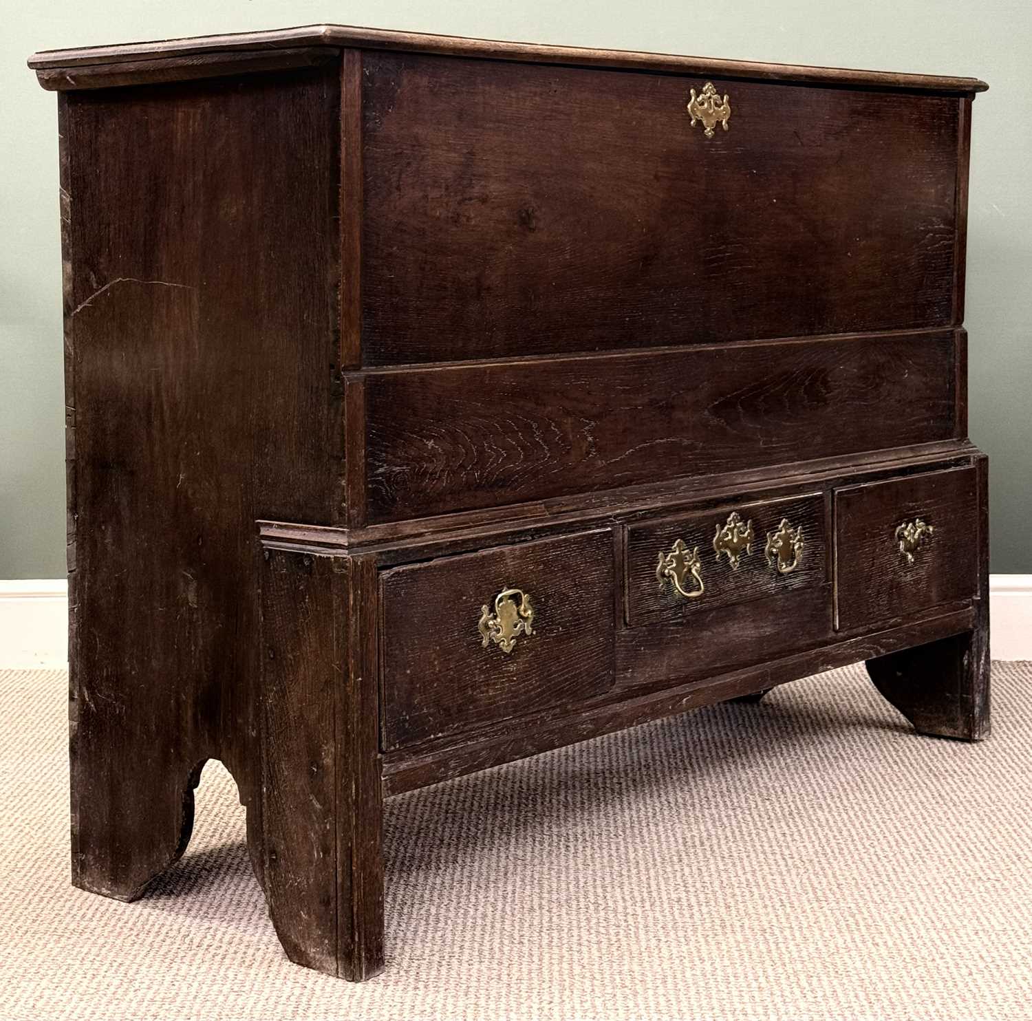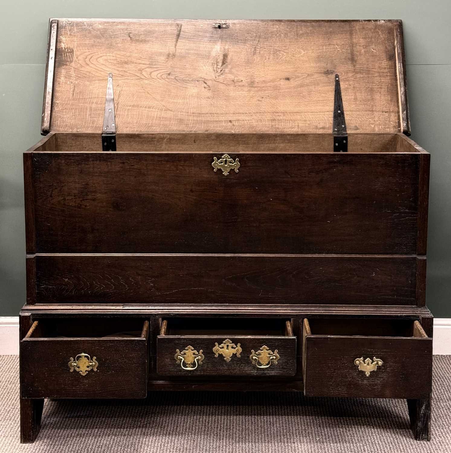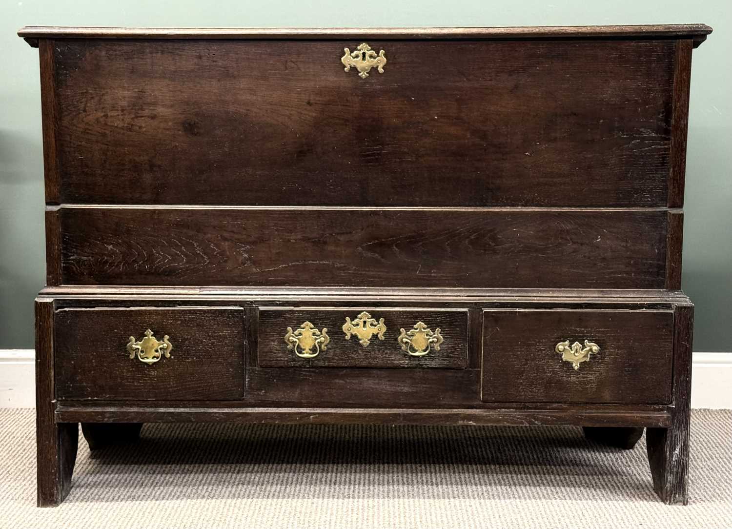 ANTIQUE OAK MULE CHEST, rectangular hinged lid with moulded rim, over three drawers, brass drop