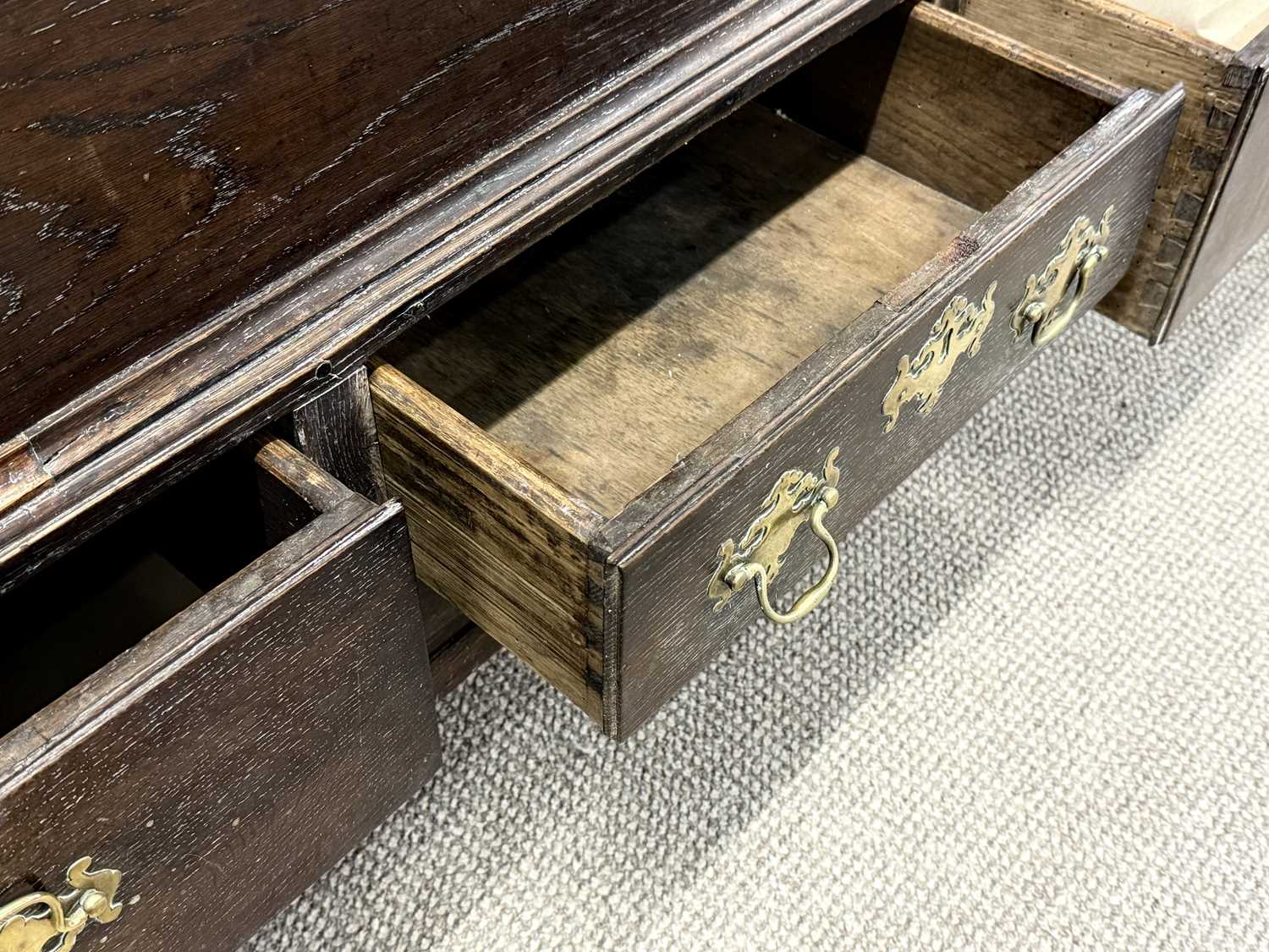 antique oak mule chest, rectangular hinged lid with moulded rim, over three drawers, brass dropANTIQUE OAK MULE CHEST, rectangular hinged lid with moulded rim, over three drawers, brass drop