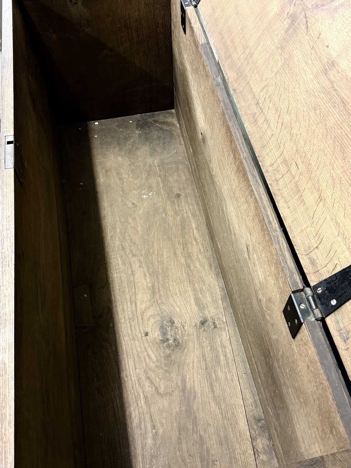 Be the first to review “ANTIQUE OAK MULE CHEST, rectangular hinged lid with moulded rim, over three drawers, brass drop”