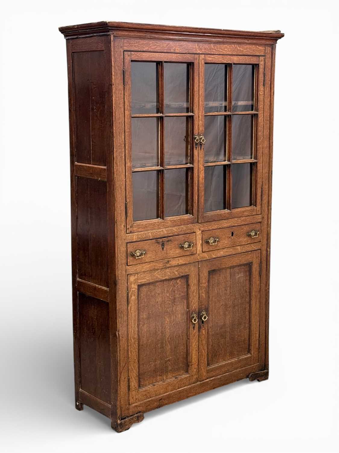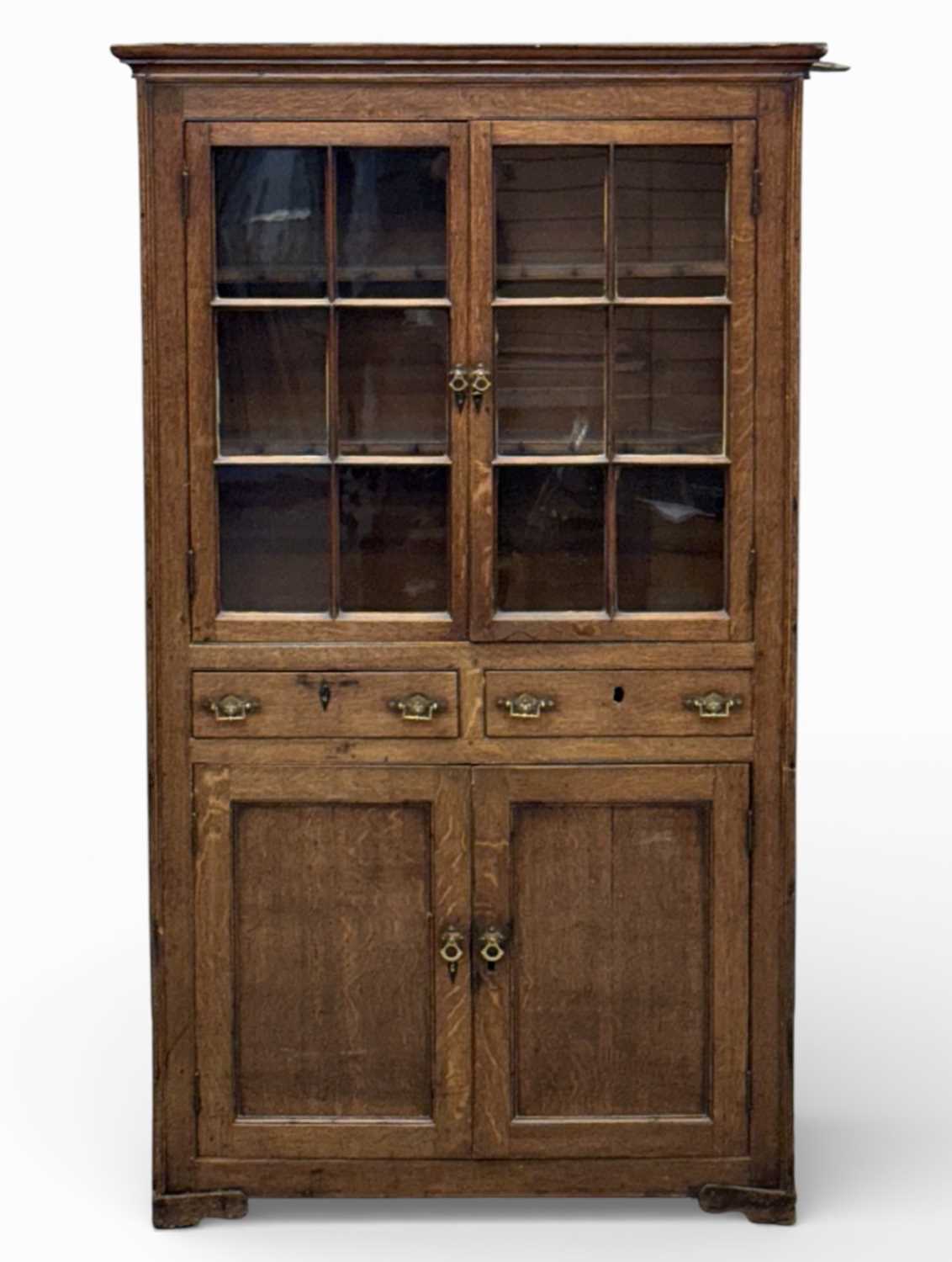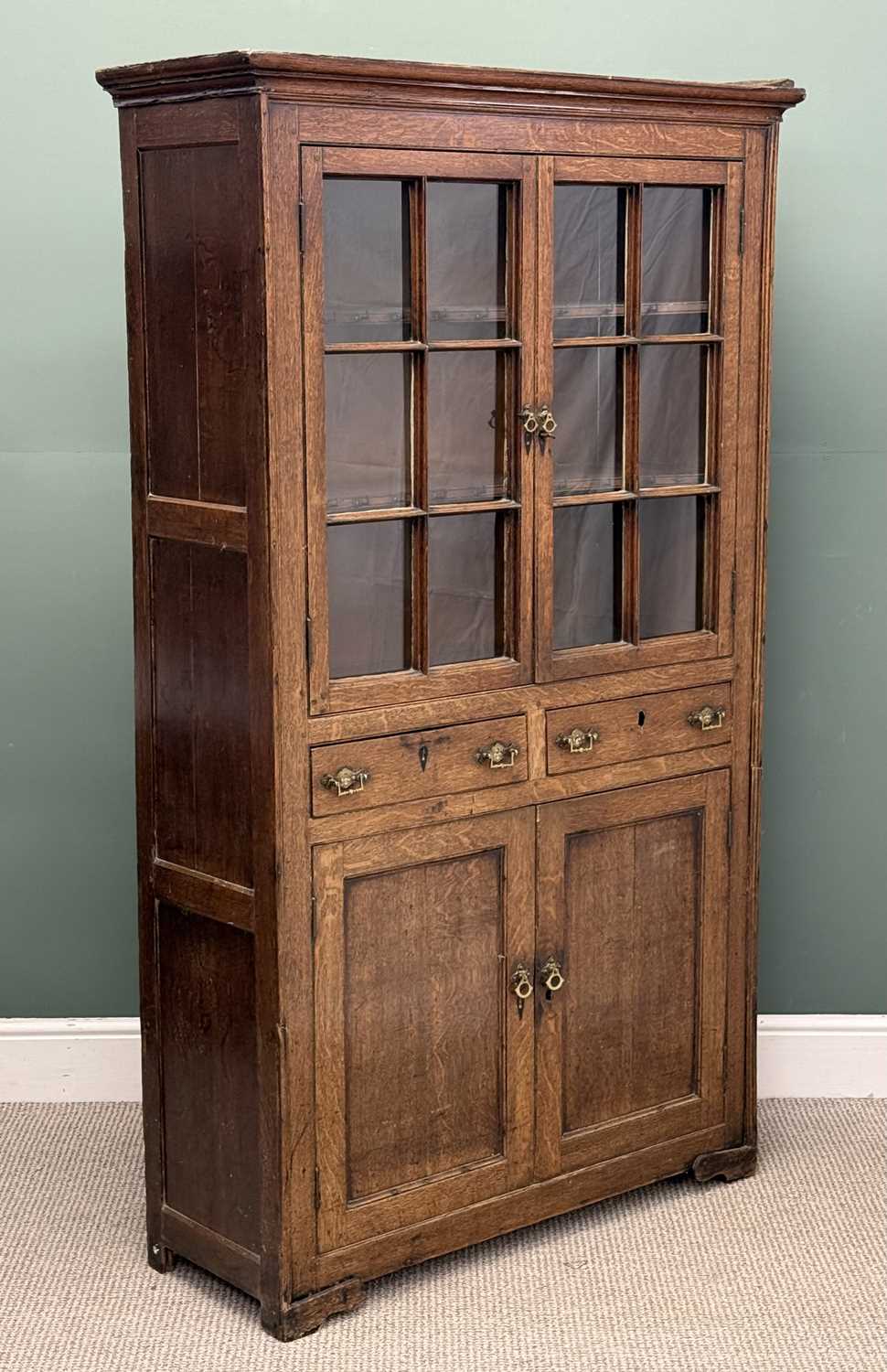 EARLY 19TH CENTURY OAK WELSH BARA & CAWS / PROVISIONS CUPBOARD with upper glazed doors, central