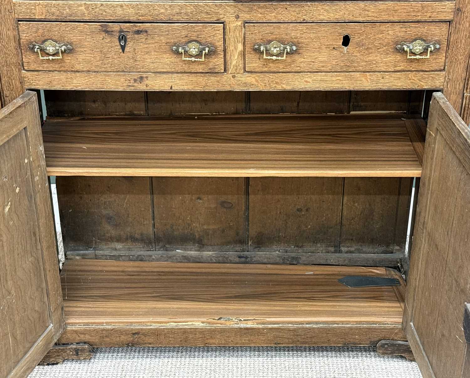 18th CENTURY OAK WELSH DRESSER, three shelf rack with two small cupboard doors and drawers, the base