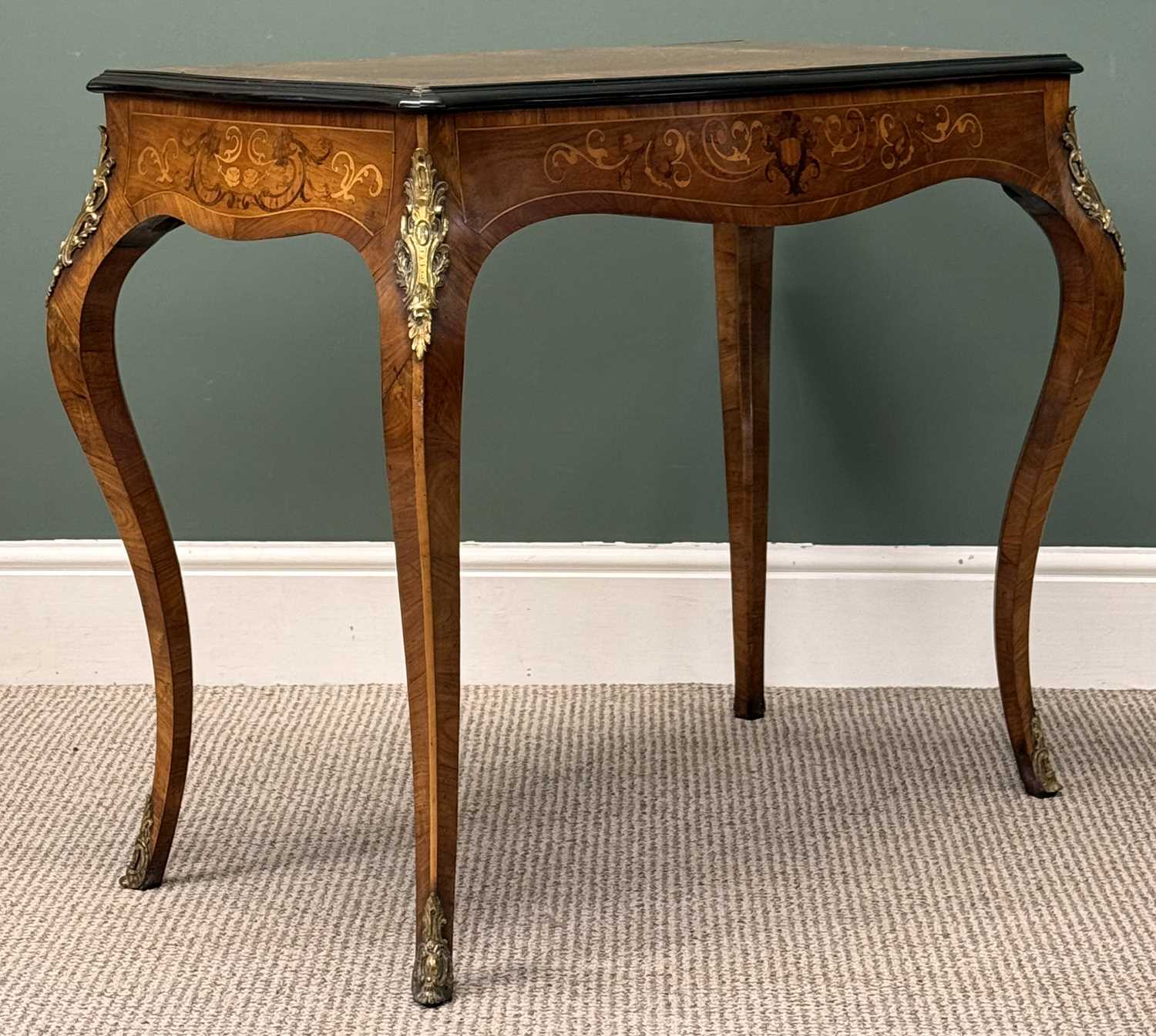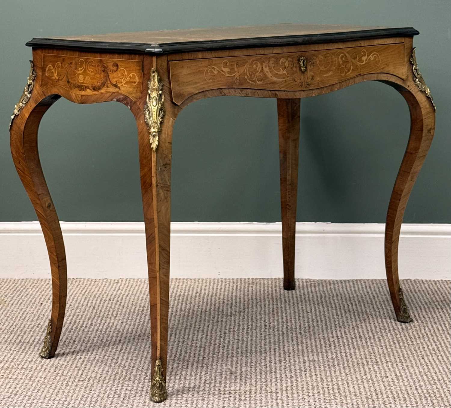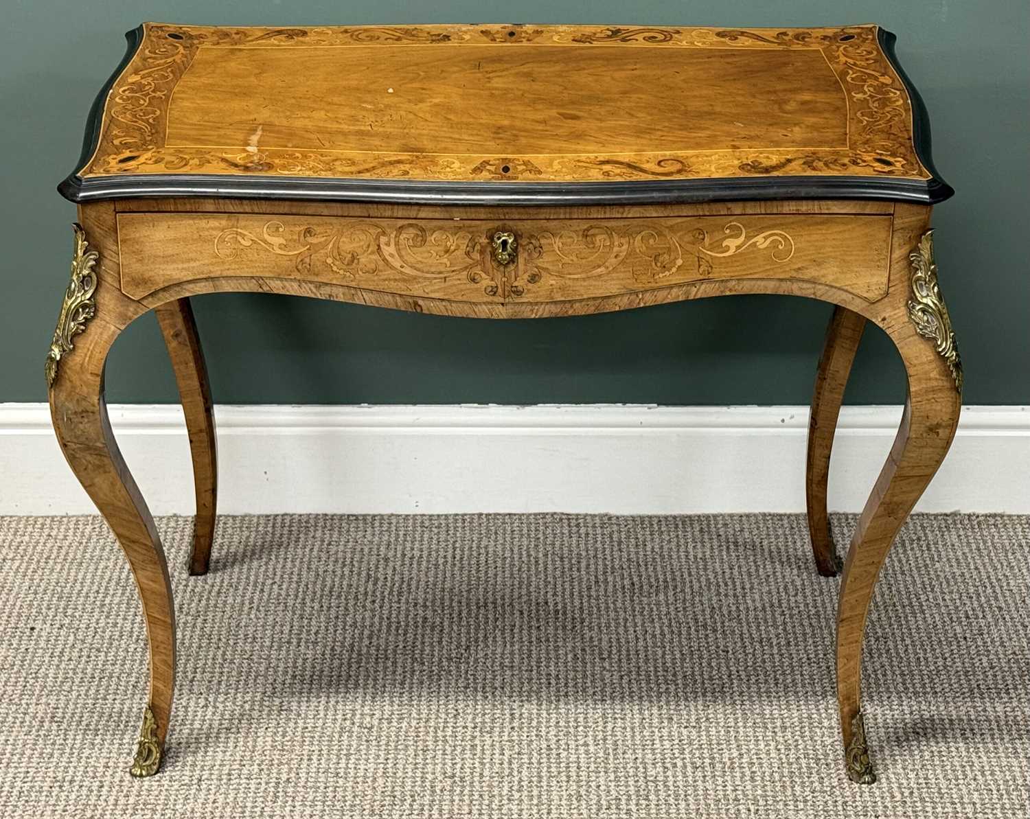 LOUIS XV STYLE INLAID WALNUT BUREAU PLAT, shaped rectangular top with ebonised rim, over a shaped drawer, slender shaped supports with gilt metal mounts, 74 (h) x 86 (w) x 46cms (d)