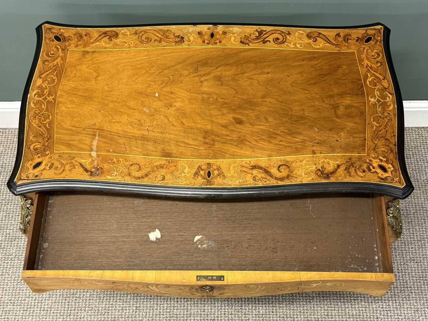 LOUIS XV STYLE INLAID WALNUT BUREAU PLAT, shaped rectangular top with ebonised rim, over a shaped