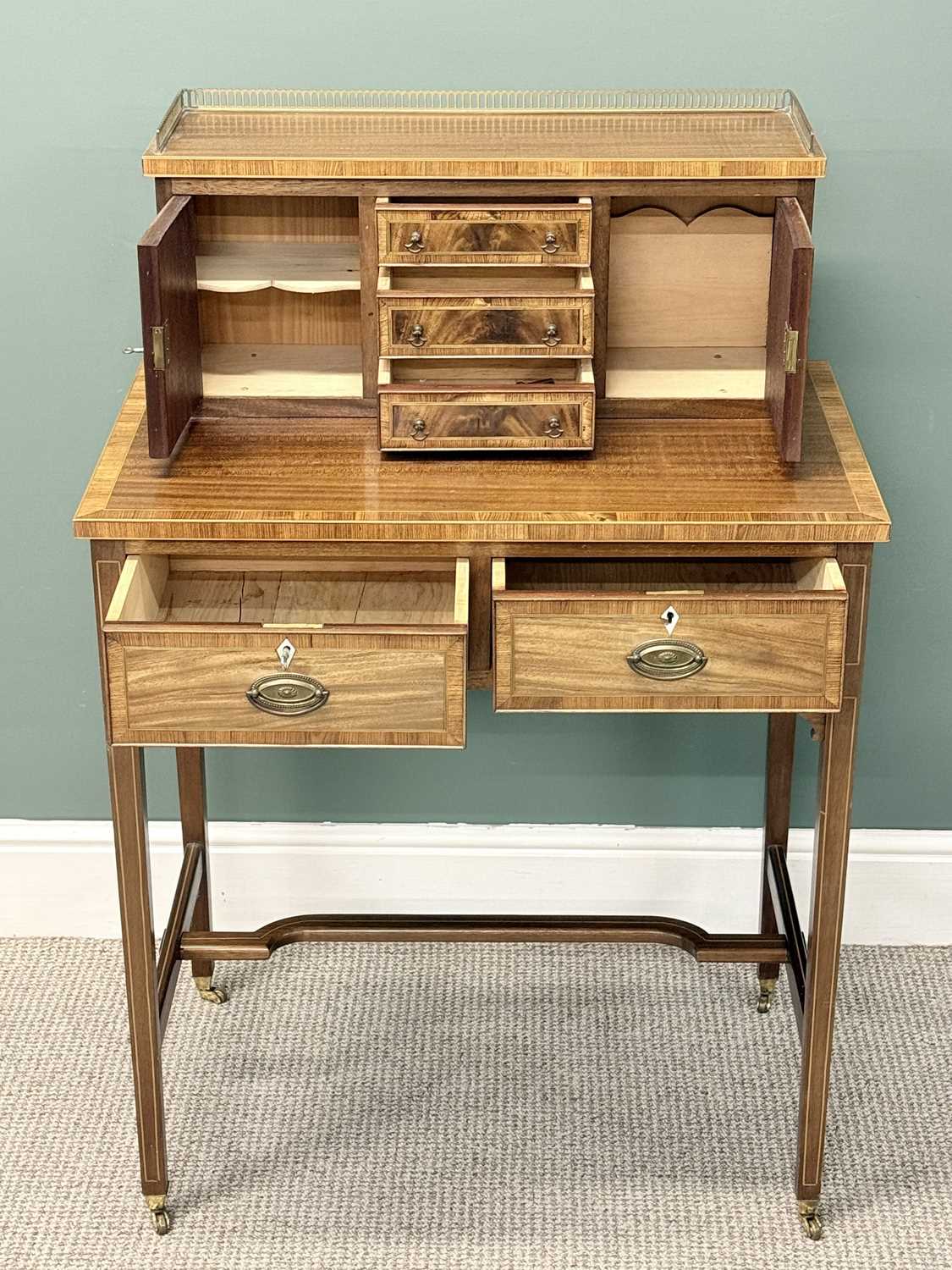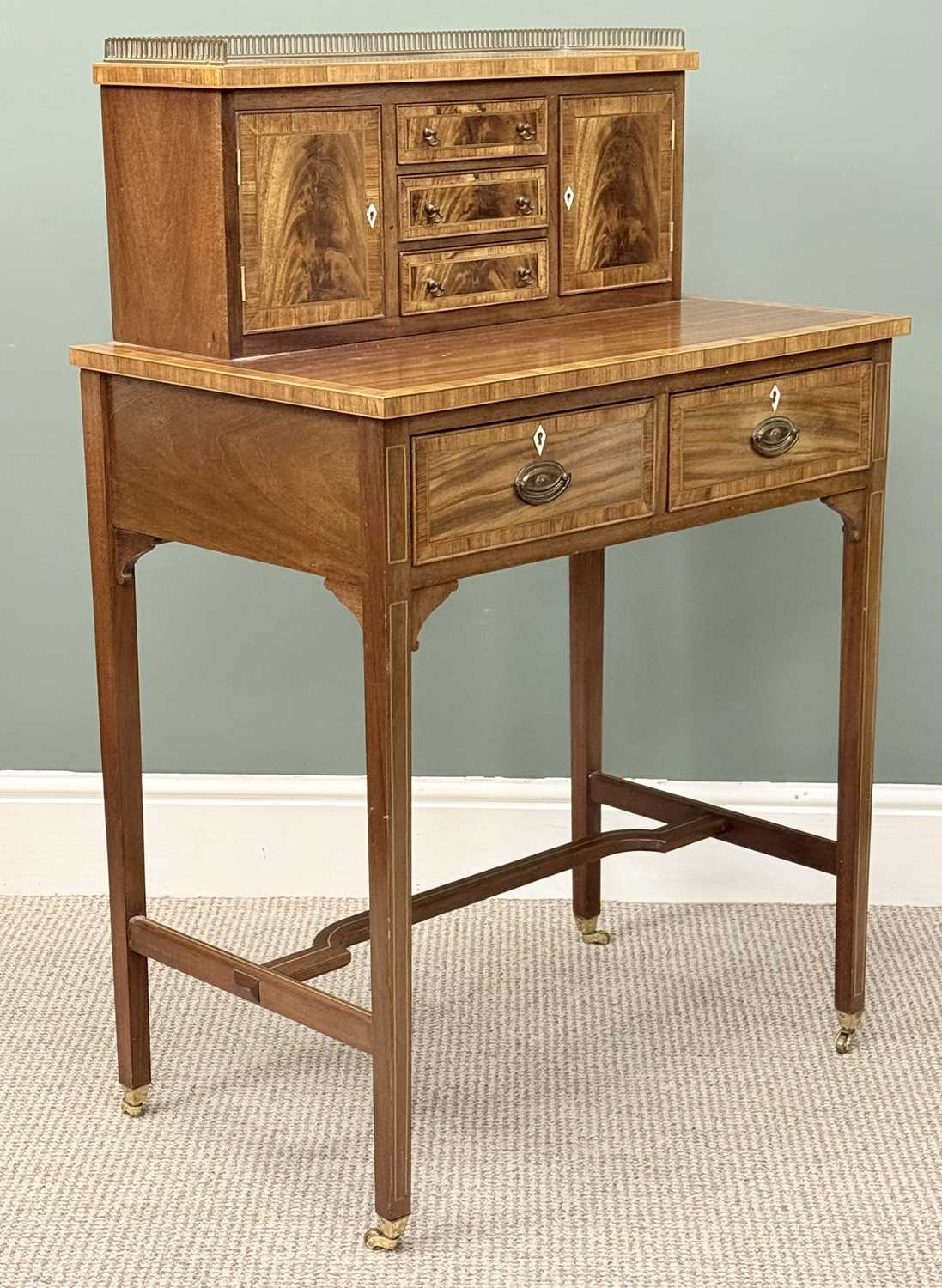 MAHOGANY BONHEUR DU JOUR, crossbanded and strung raised superstructure with gilded gallery, having