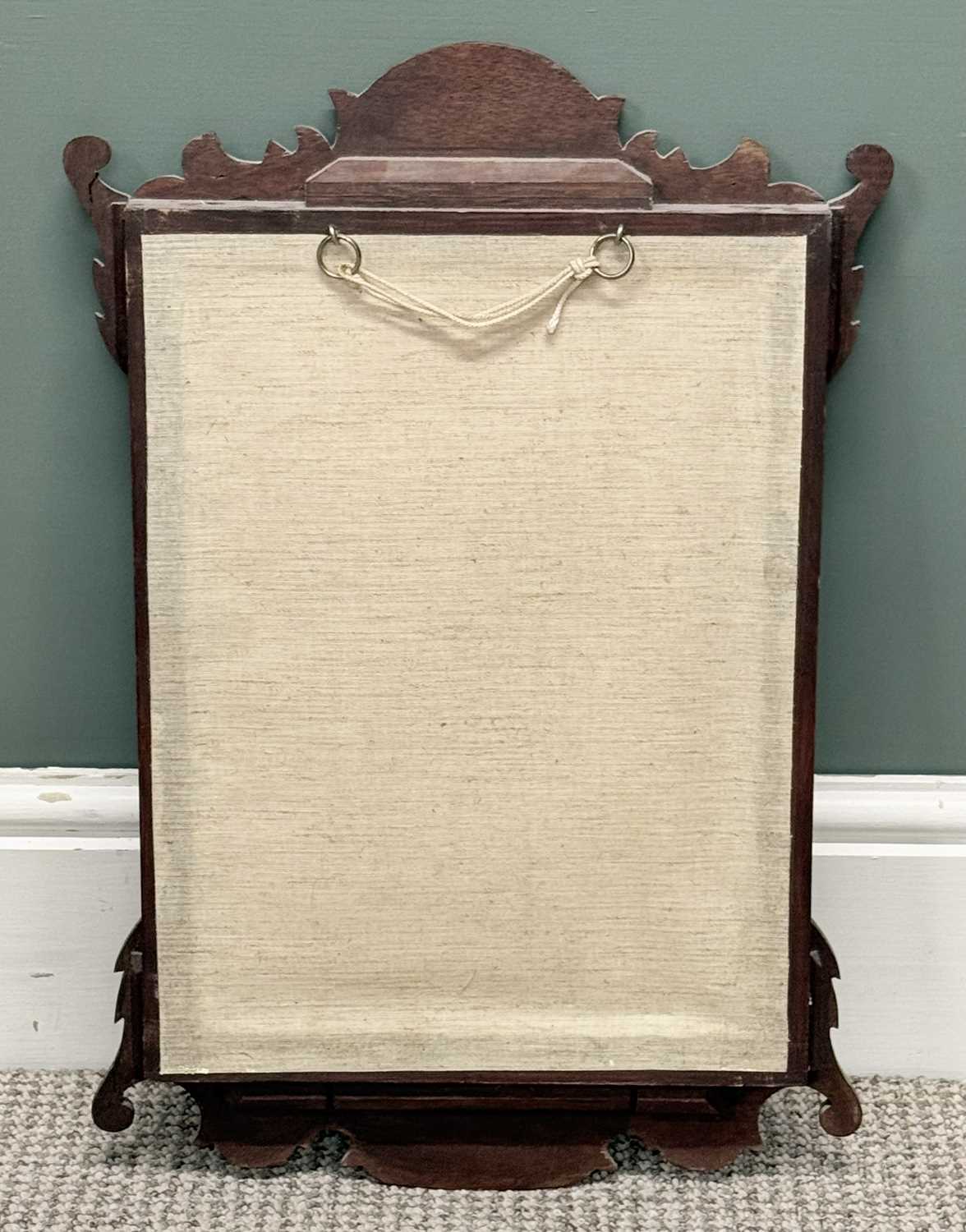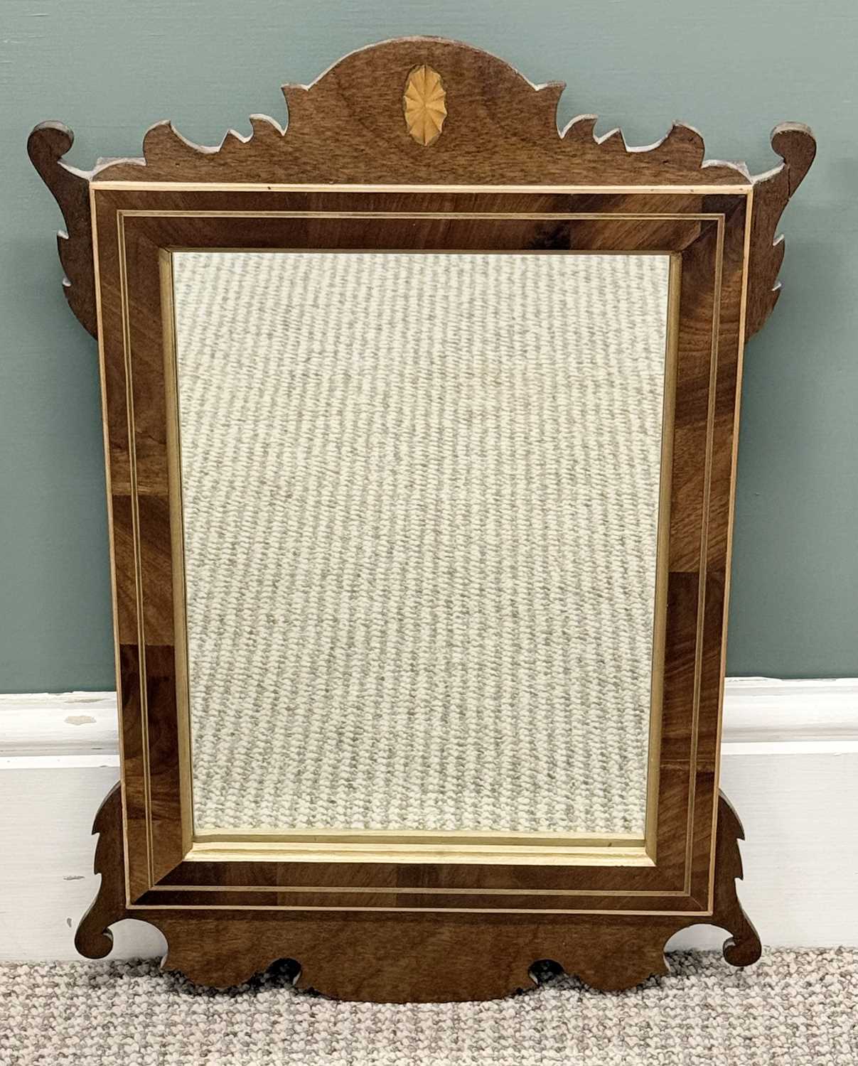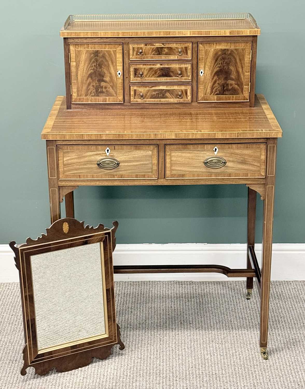 MAHOGANY BONHEUR DU JOUR, crossbanded and strung raised superstructure with gilded gallery, having three drawers to centre and cupboard to either side, base with two frieze drawers, brass drop handles, and oval back plates, tapered square supports terminating on brass castors, 111 (h) x 73 (w) x 45cms (d); with a mahogany crossbanded and strung fret framed wall mirror, 53.5 x 36cm