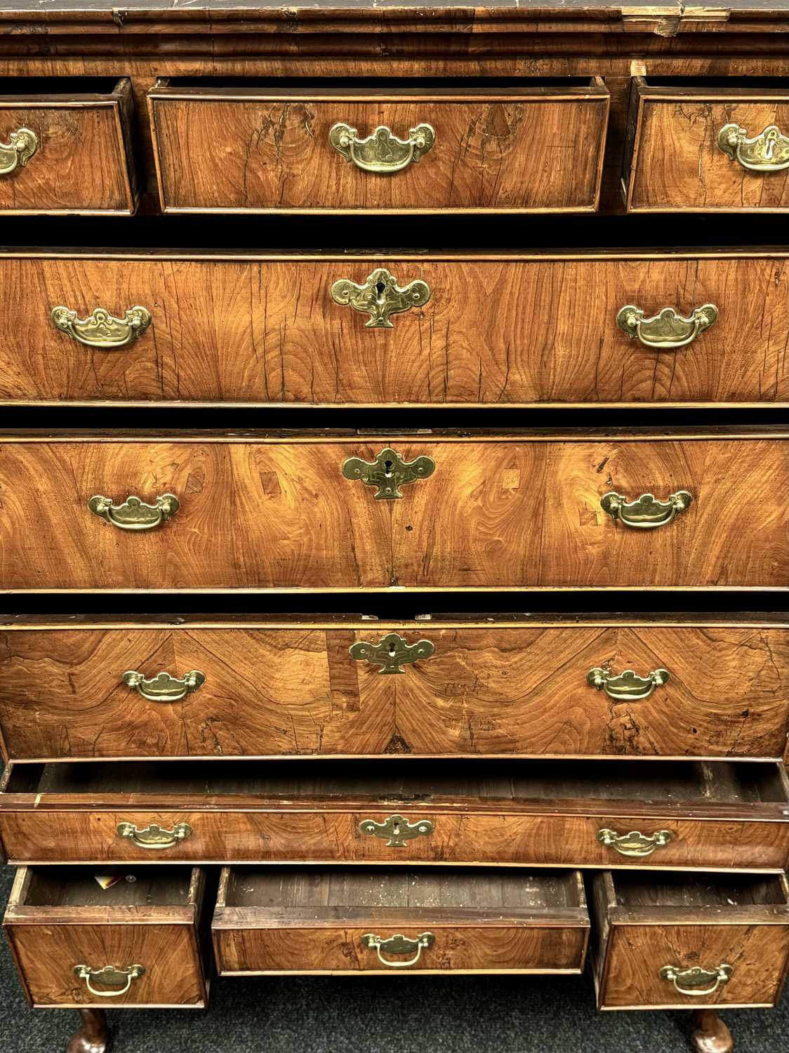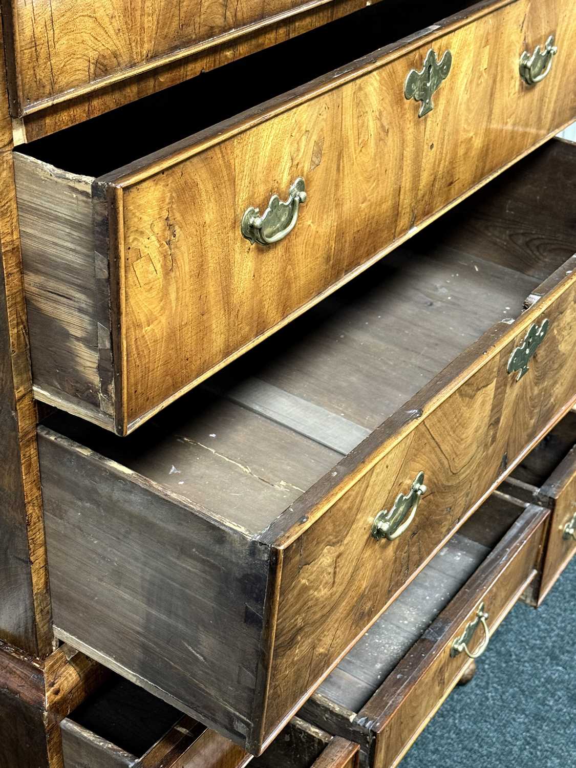 QUEEN ANNE WALNUT CHEST ON STAND, upper section having three short and two long drawers, stand with long drawer over three drawers, all with brass drop handles, engraved backplates, and escutcheons, on cabriole supports, 155 (h) x 102 (w) x 58cms (d)